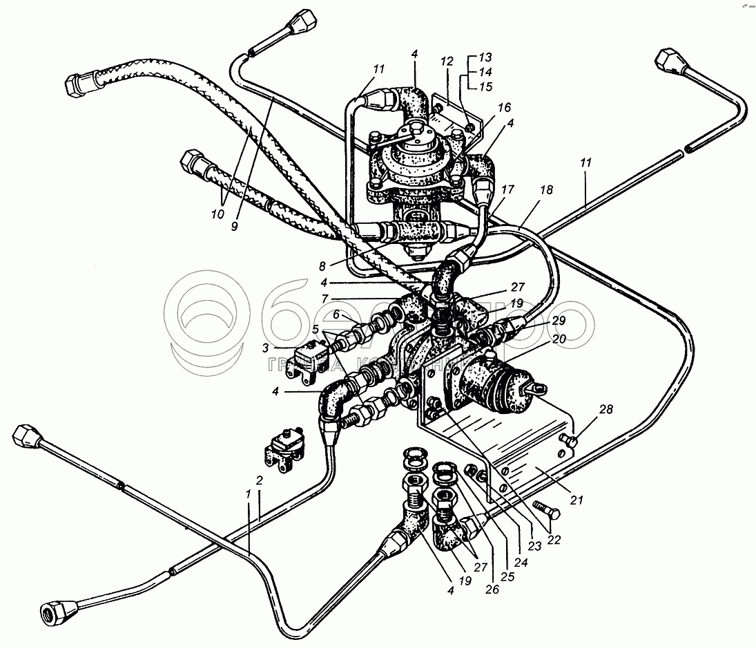 Каталог запасных частей к технике: МАЗ-5549. Трубопроводы к тормозным кранам МАЗ-509А