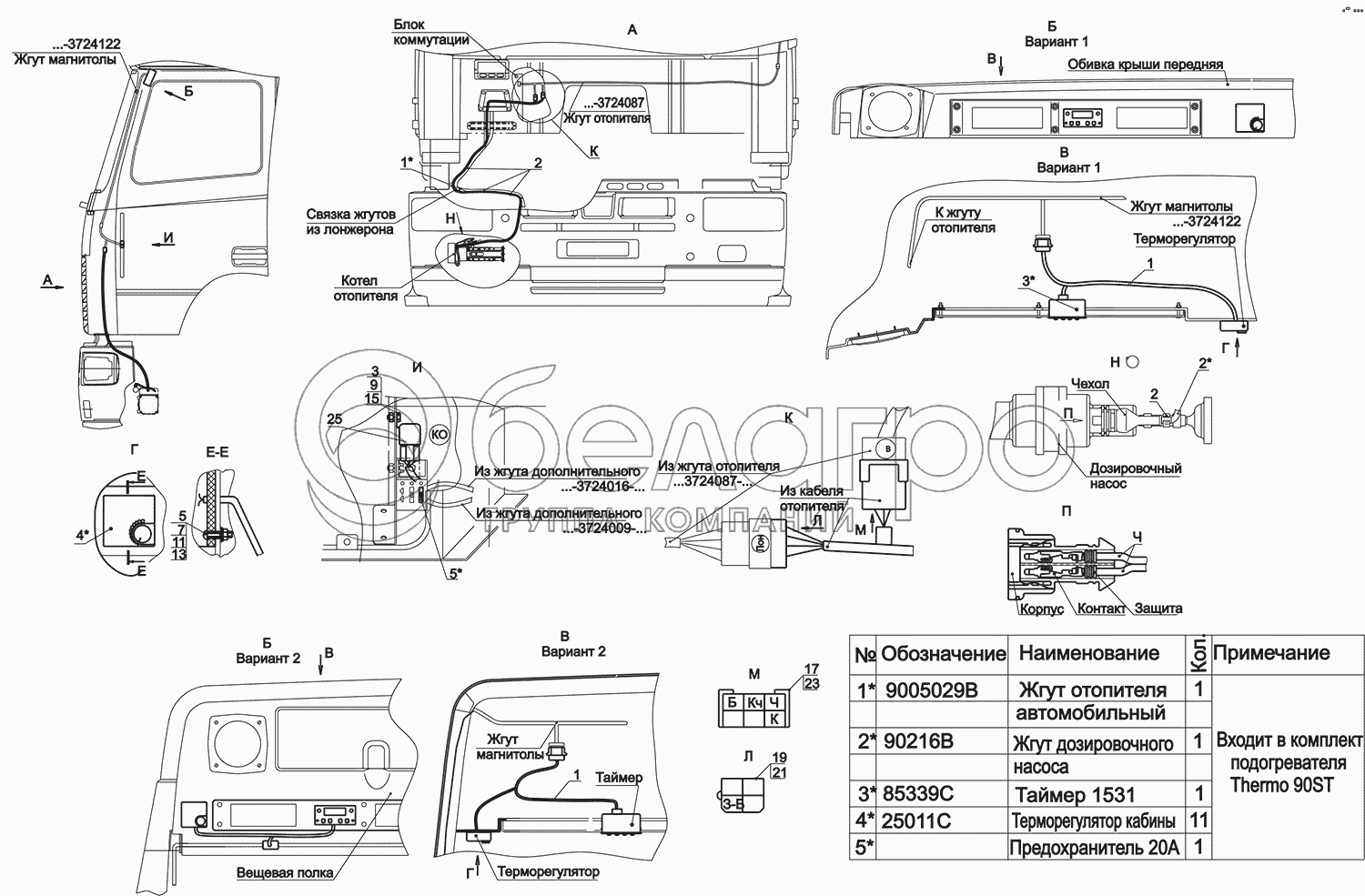 Каталог запасных частей к технике: МАЗ-5550V3 (V5). Установка электрооборудования подогревателя 5440E9-3700085