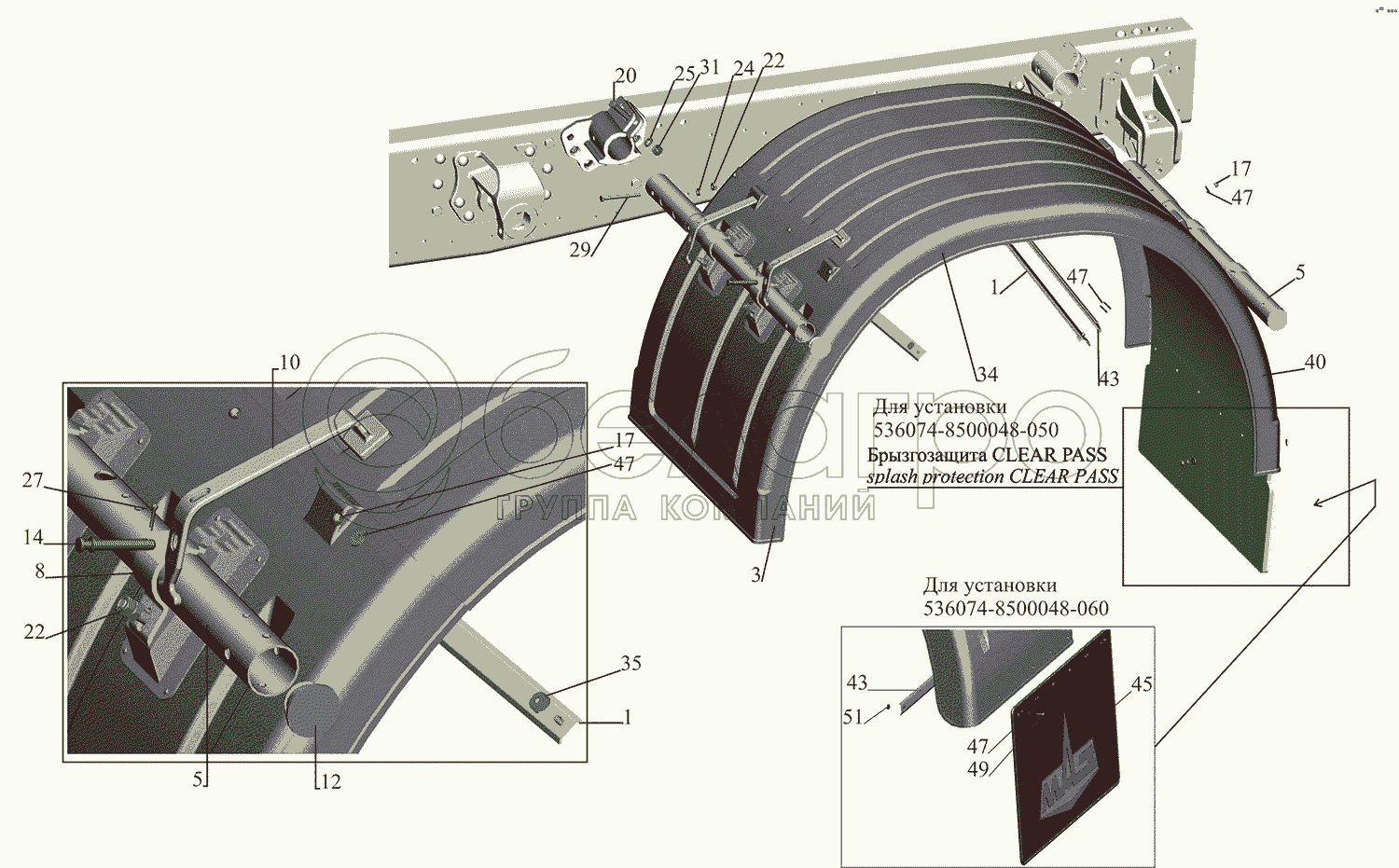 Каталог запасных частей к технике: МАЗ-5550V3 (V5). Установка крыльев 536074-8500048-050, -060