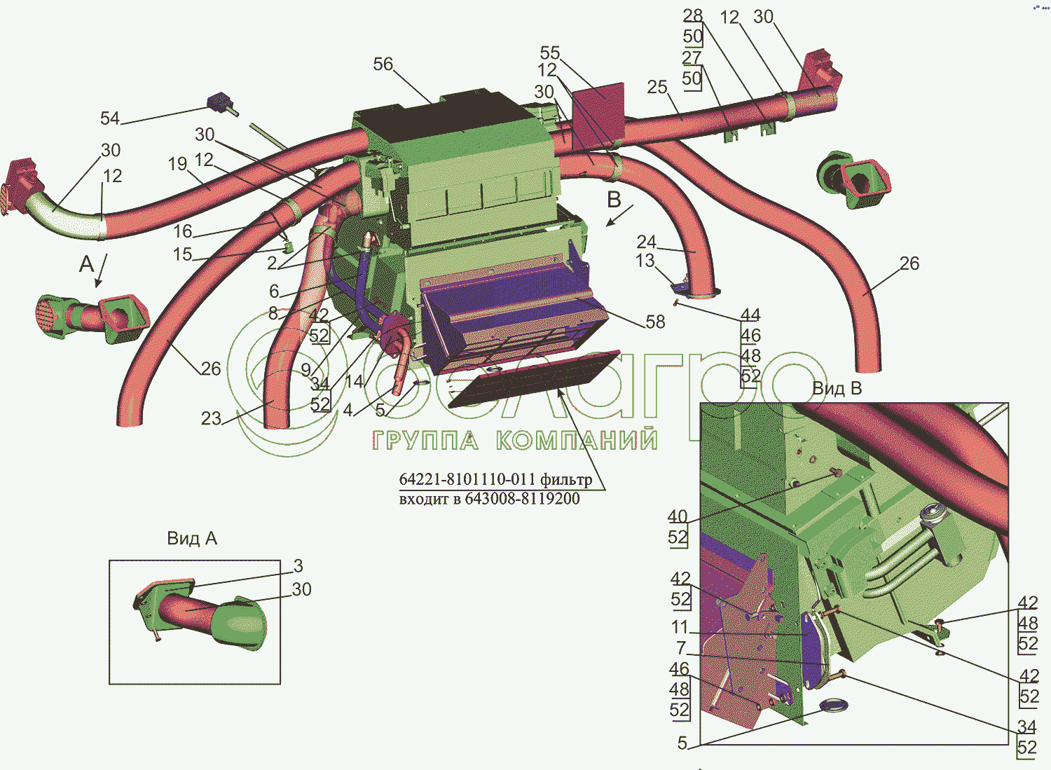 Каталог запасных частей к технике: МАЗ-5550V3 (V5). Установка отопителя 643008-8100001