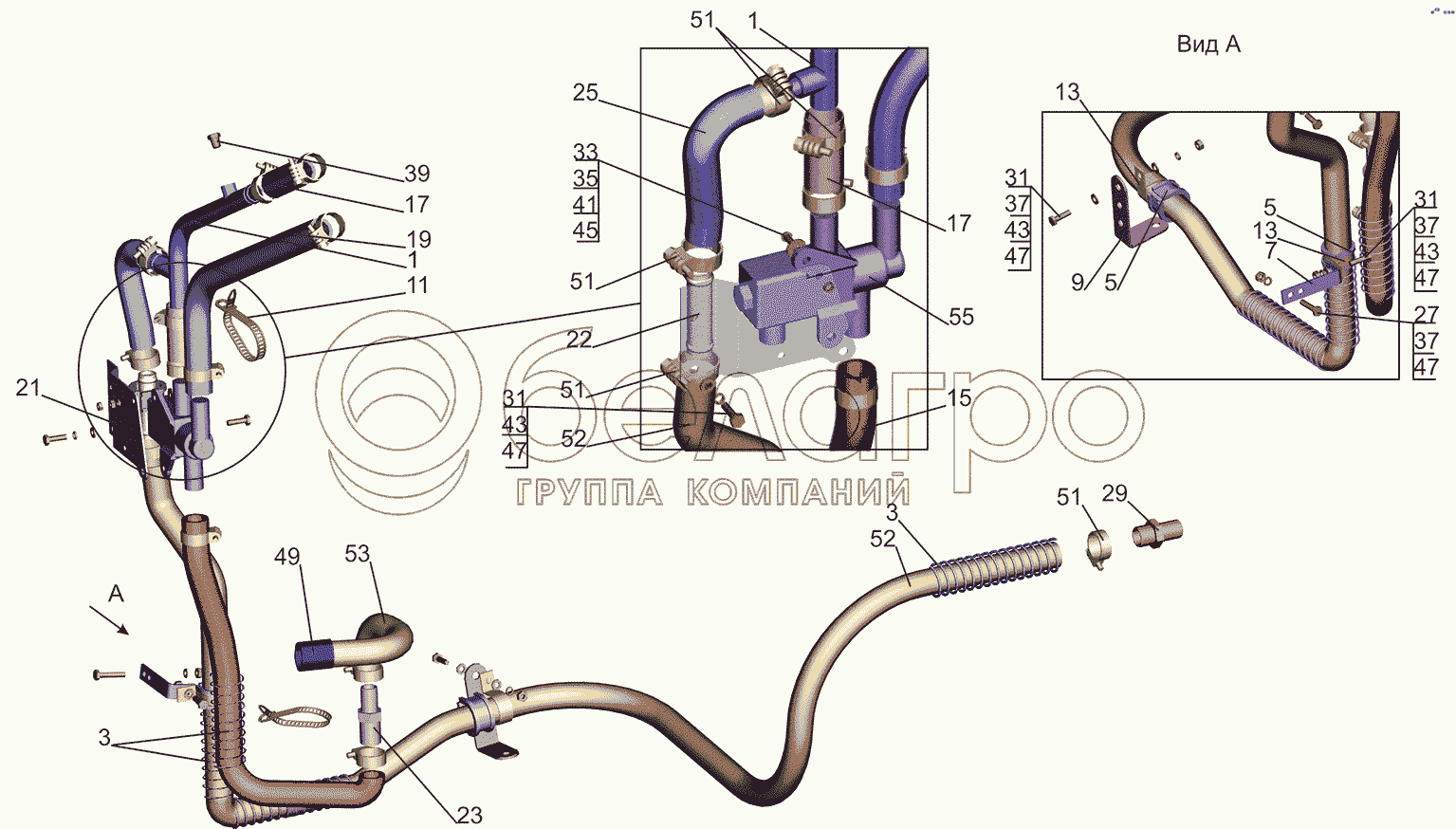 Каталог запасных частей к технике: МАЗ-5550V3 (V5). Установка шлангов отопителя 5340V4-8100006-020