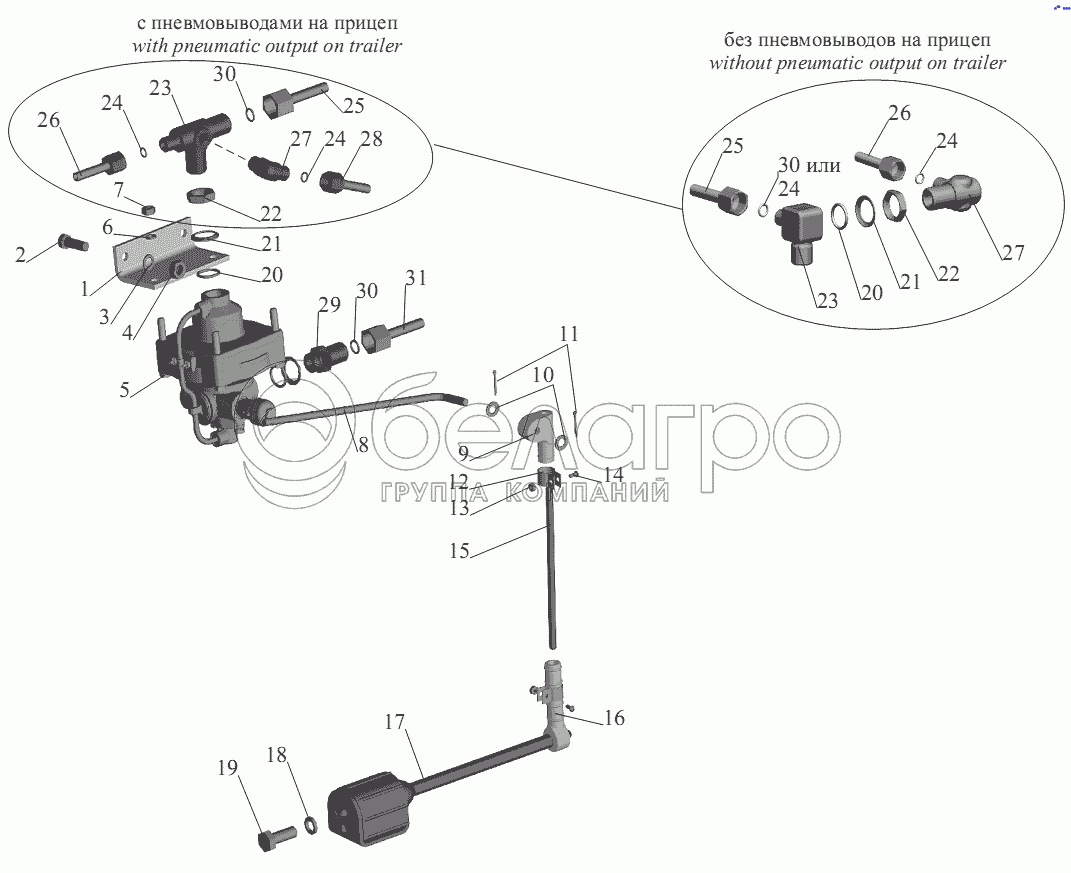 Установка клапана управления тормозами прицепа и присоединительной арматуры