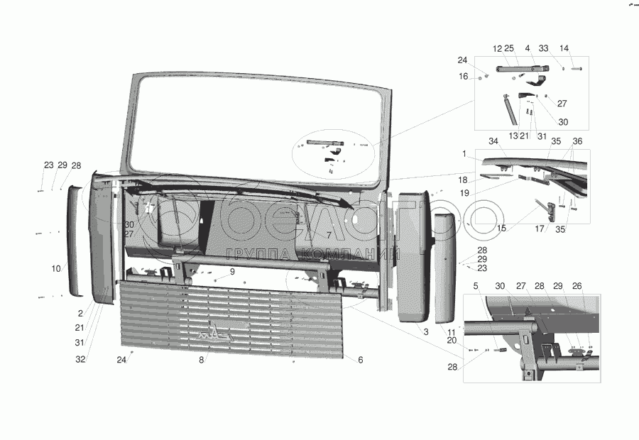 Каталог запасных частей к технике: МАЗ-555142. Установка облицовки и боковых щитков