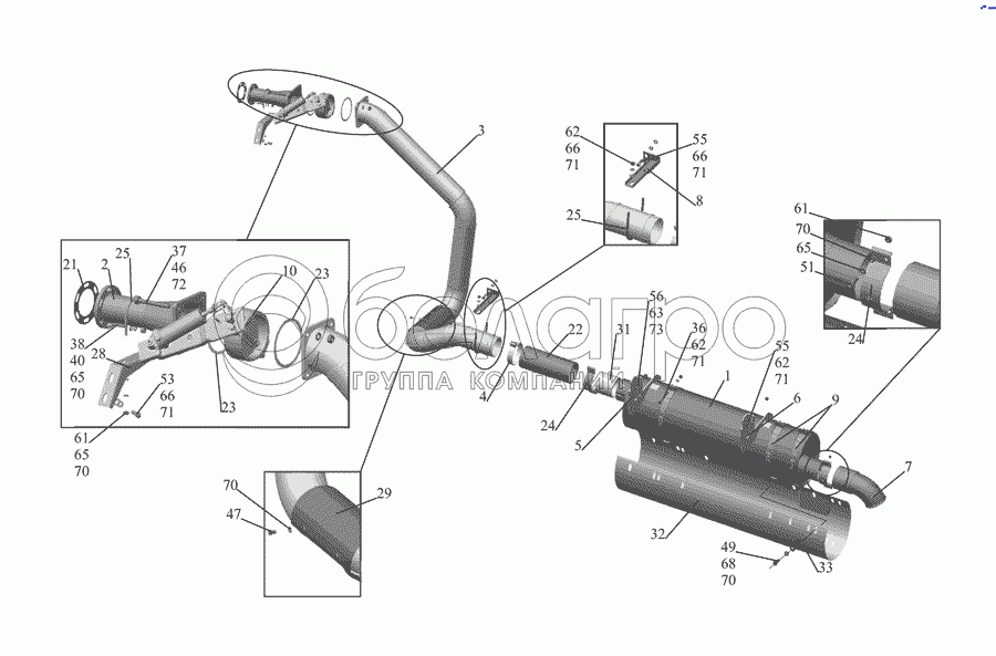 Каталог запасных частей к технике: МАЗ-555142. Установка системы выпуска газов 555142-1200001-060