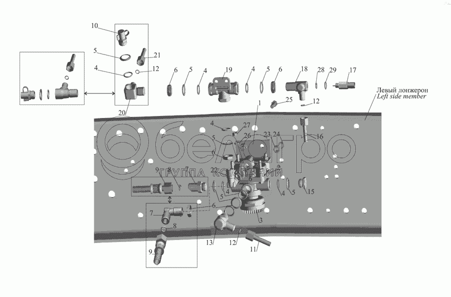 Каталог запасных частей к технике: МАЗ-555142. Установка ускорительного клапана 555102-3518004