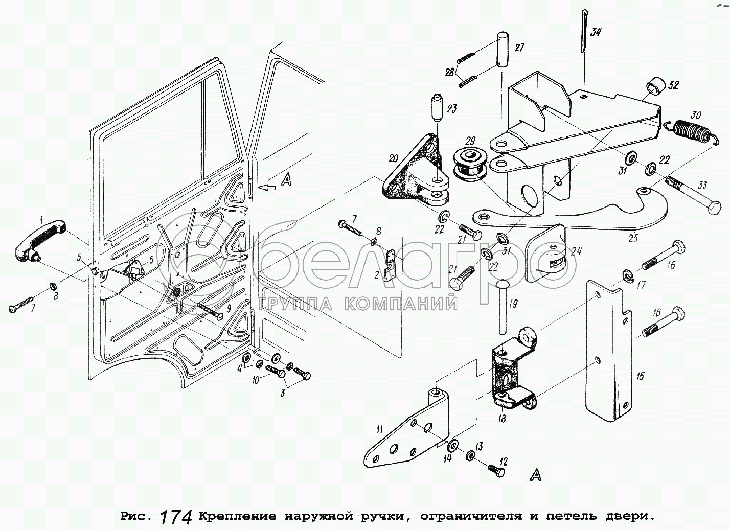 Каталог запасных частей к технике: МАЗ-5551. Крепление наружной ручки, ограничителя и петель двери