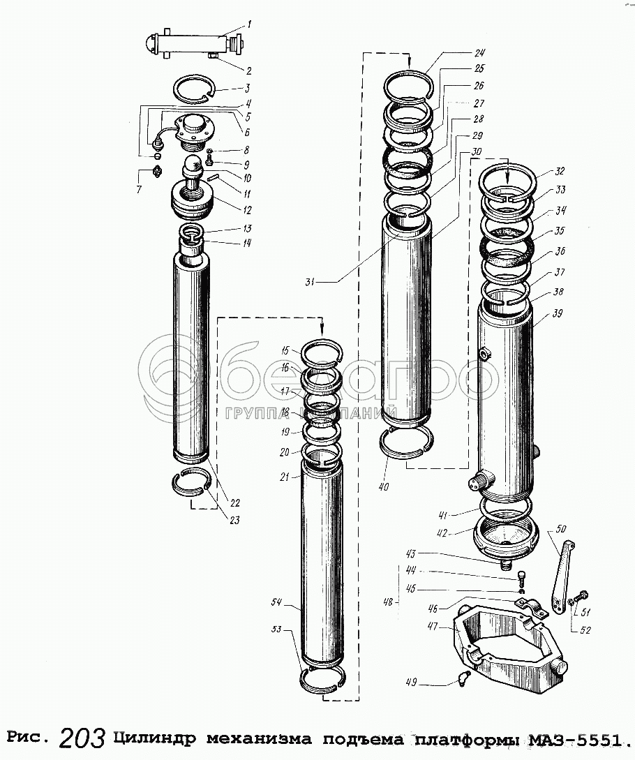 Каталог запасных частей к технике: МАЗ-5551. Цилиндр механизма подъема платформы МАЗ-5551