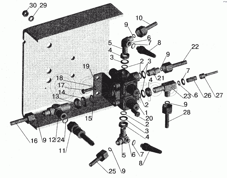 Каталог запасных частей к технике: МАЗ-5551 (2003). Крепление четырехконтурного клапана МАЗ-551605, 551603
