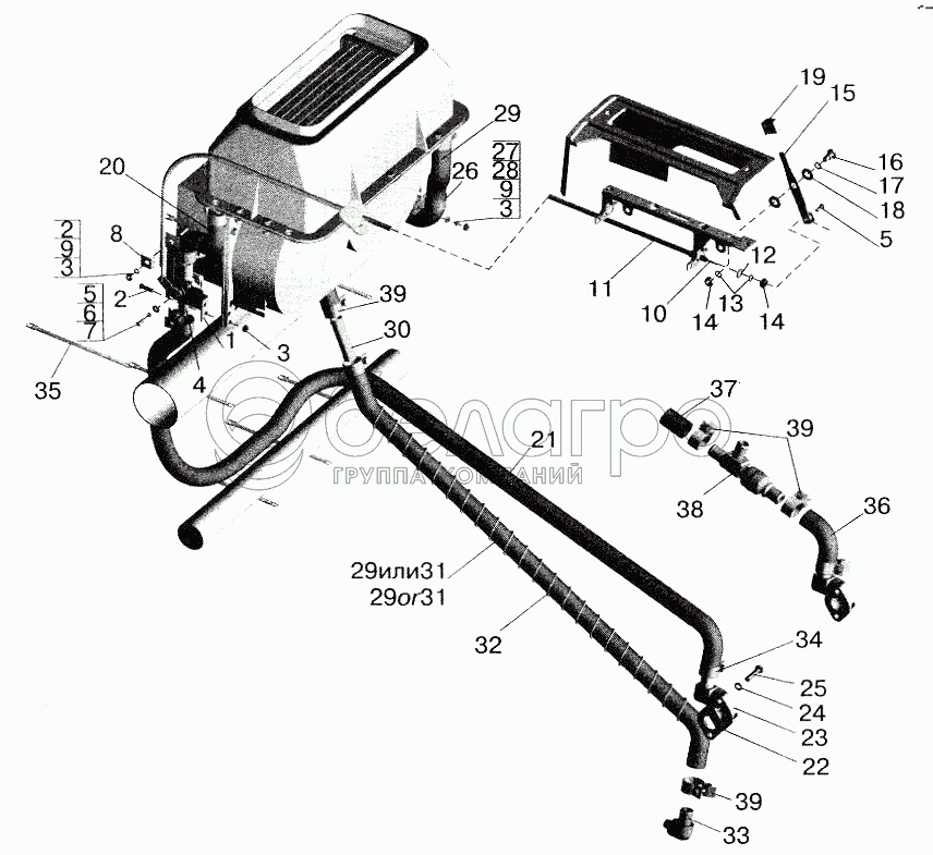 Каталог запасных частей к технике: МАЗ-5551 (2003). Установка шлангов и крана управления отопителем