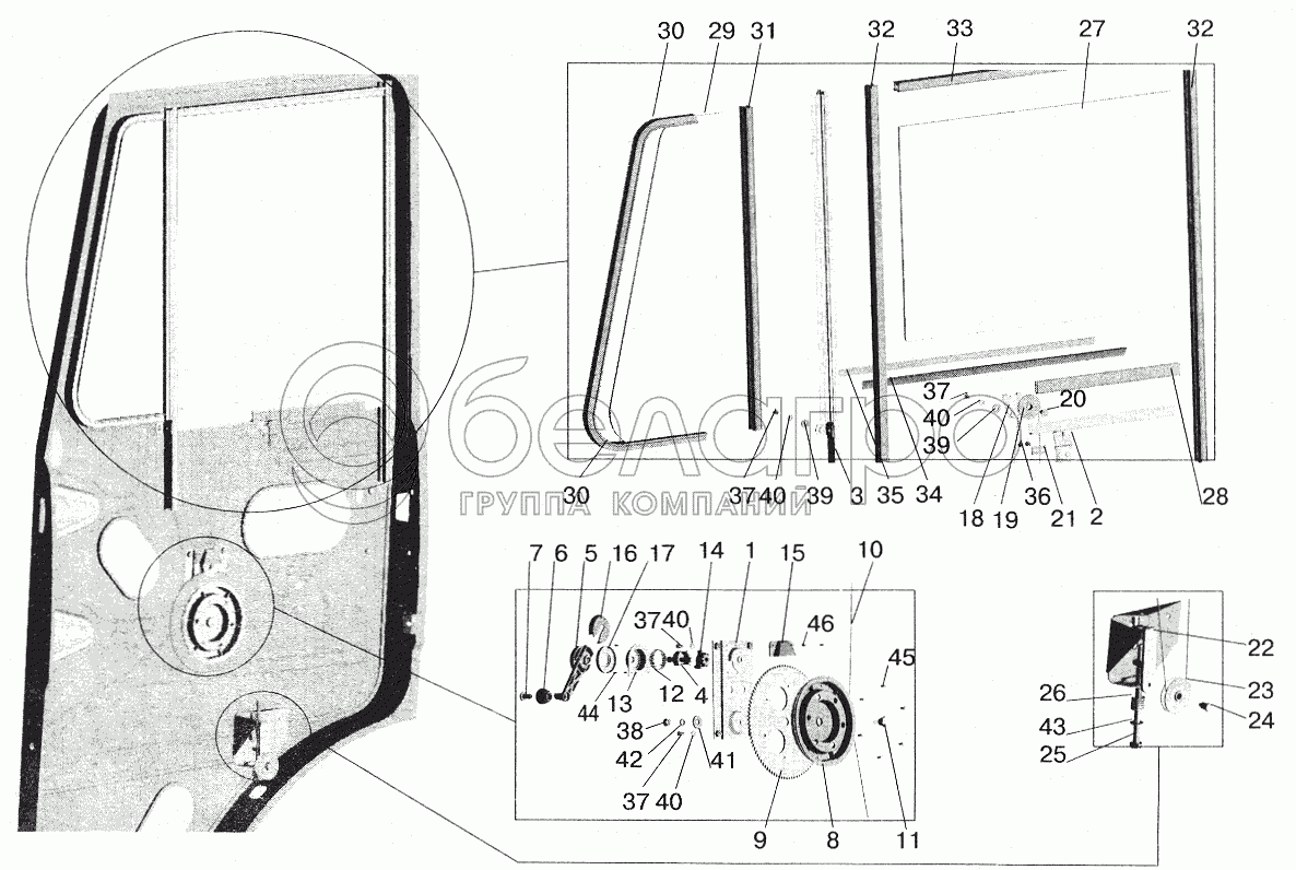 Каталог запасных частей к технике: МАЗ-5551 (2003). Установка стеклоподъемника и ручки стеклоподъемника