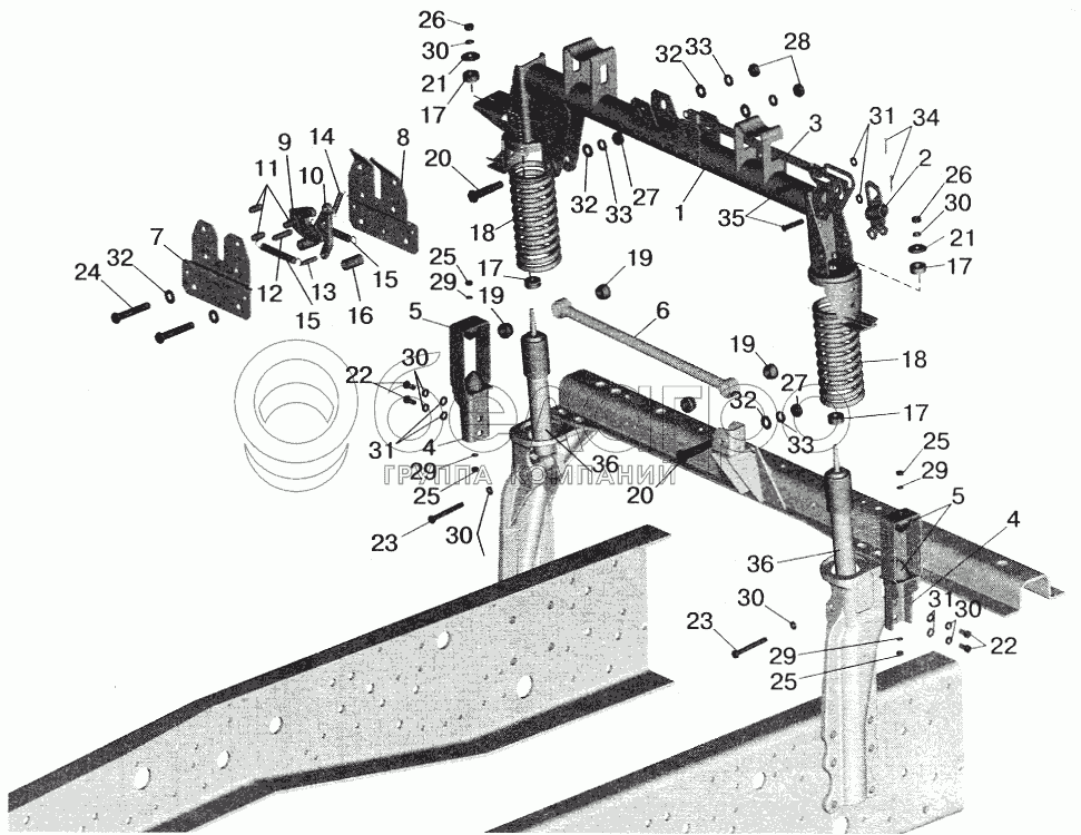 Каталог запасных частей к технике: МАЗ-5551 (2003). Заднее подрессоривание большой кабины
