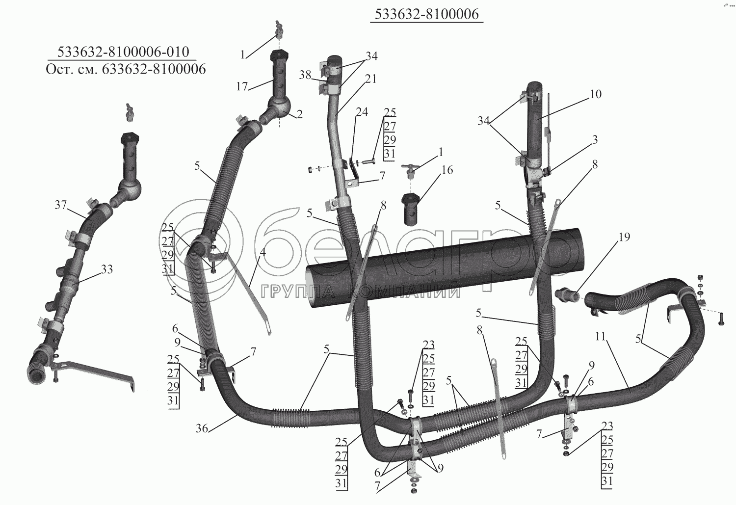Каталог запасных частей к технике: МАЗ-630333. Установка шлангов отопителя