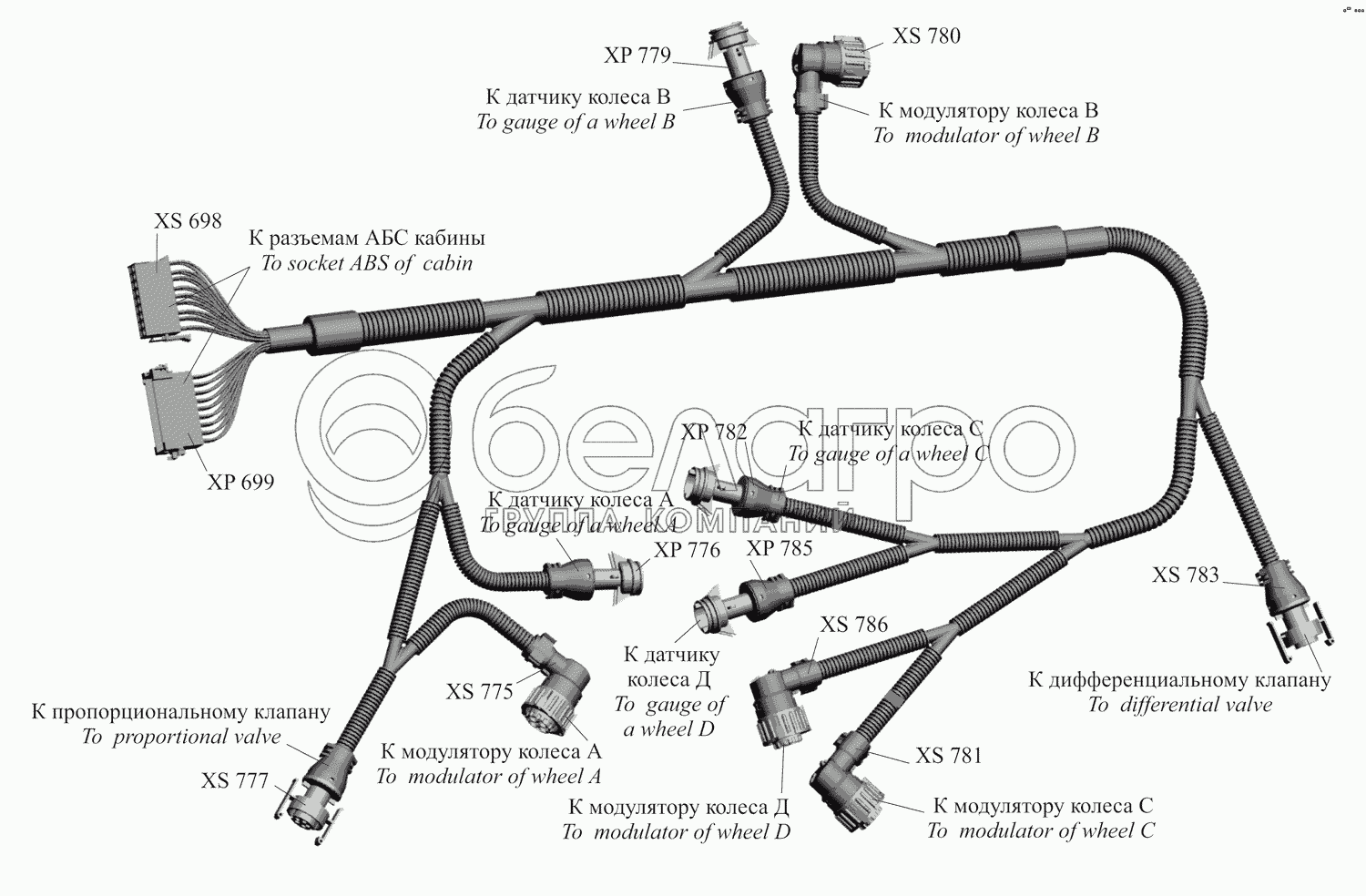 Каталог запасных частей к технике: МАЗ-630333. Жгут АБС по шасси