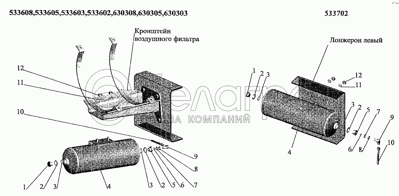 Установка ресивера и присоединительной арматуры на МАЗ-533608, МАЗ-533605, МАЗ-533603, МАЗ-533602 (лонжерон левый)