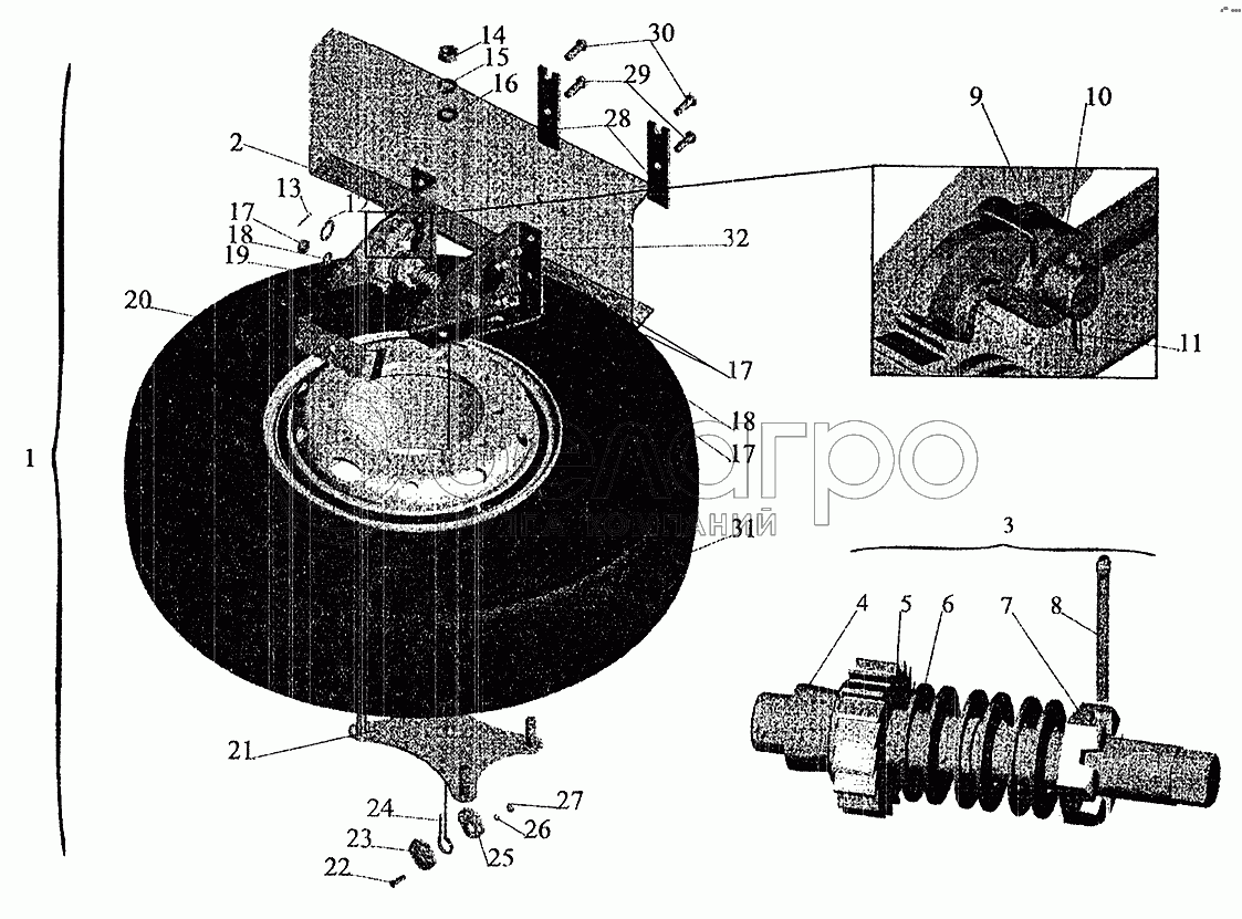 Каталог запасных частей к технике: МАЗ-6303 (2005). Установка запасного колеса 63035-3100001-10