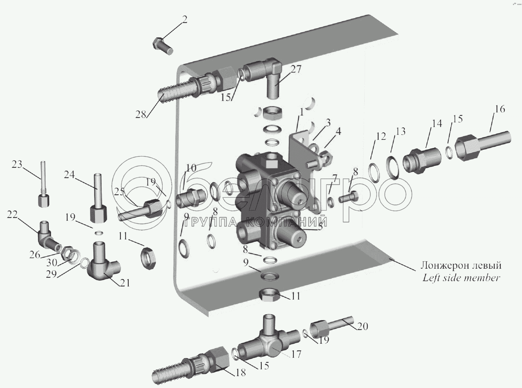 Каталог запасных частей к технике: МАЗ-6303A3, 6303A5. Крепление четырехконтурного клапана 630305-3515002