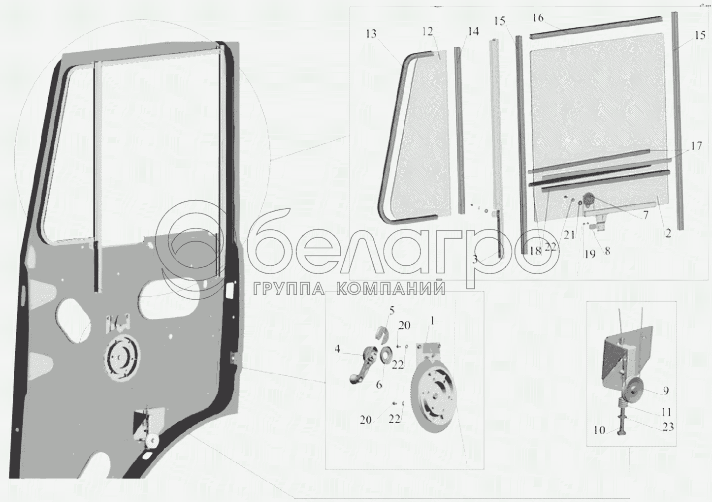 Каталог запасных частей к технике: МАЗ-6303A3, 6303A5. Установка стеклоподъемника и ручки стеклоподъемника