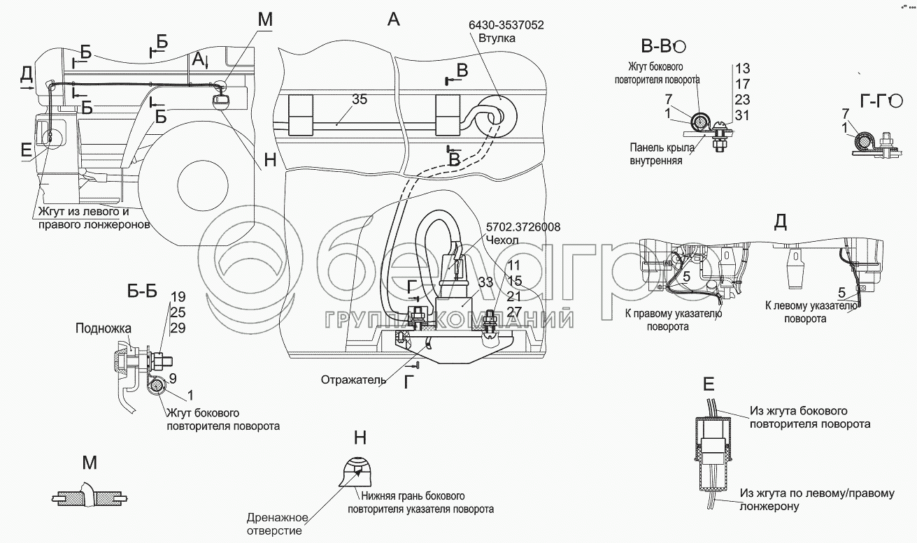 Каталог запасных частей к технике: МАЗ-631019. Установка боковых указателей поворота 6430-3700150