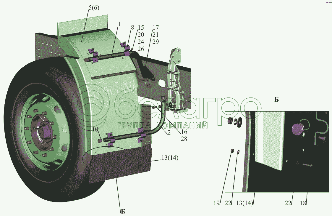 Каталог запасных частей к технике: МАЗ-631019. Установка брызговиков передних колес 643019-8400030-001
