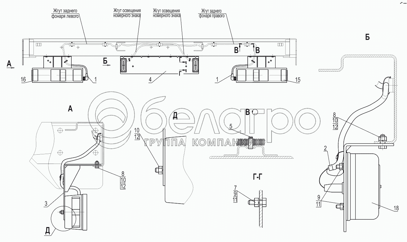 Каталог запасных частей к технике: МАЗ-631019. Установка задних фонарей 631019-3700009