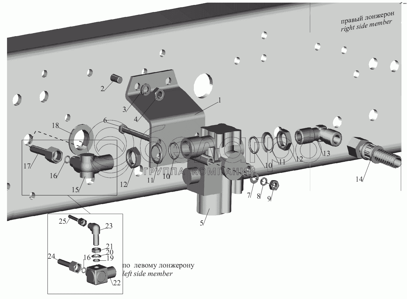 Каталог запасных частей к технике: МАЗ-631236. Установка передних модуляторов и присоединительной арматуры