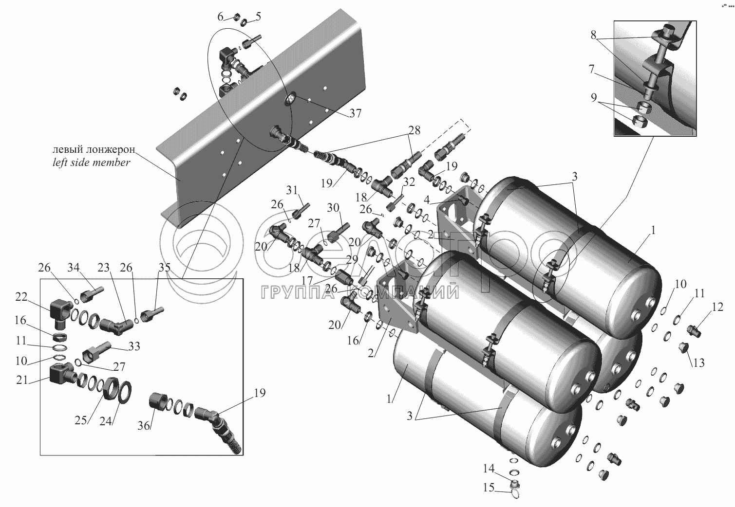 Каталог запасных частей к технике: МАЗ-631236. Установка ресиверов и присоединительной арматуры