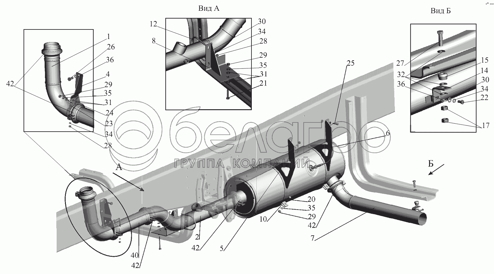Каталог запасных частей к технике: МАЗ-631236. Установка системы выпуска 555035-1200001