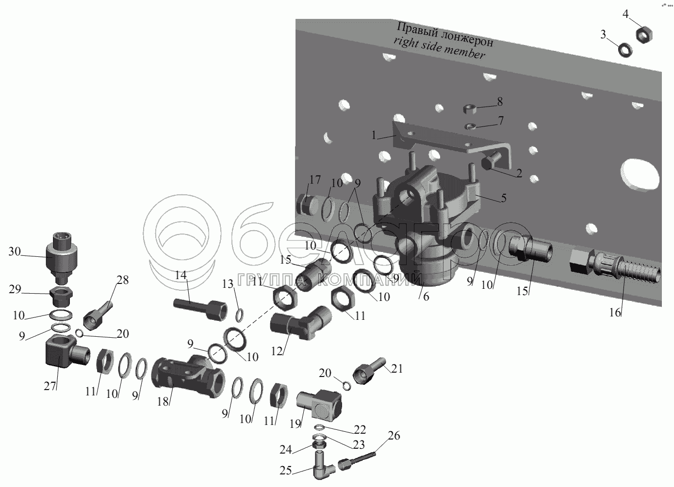 Каталог запасных частей к технике: МАЗ-631236. Установка ускорительного клапана и присоединительной арматуры