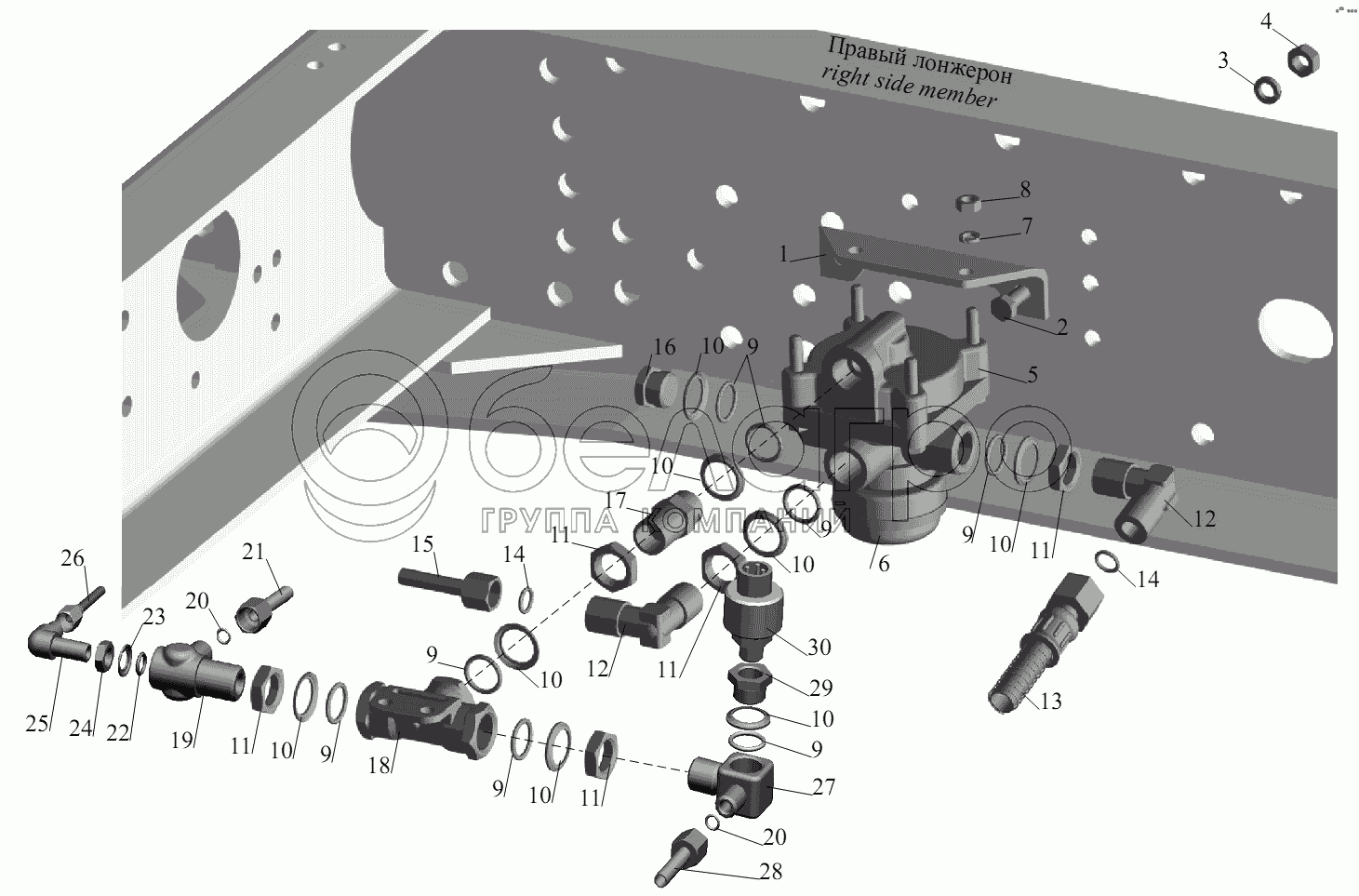 Каталог запасных частей к технике: МАЗ-631236. Установка ускорительного клапана и присоединительной арматуры