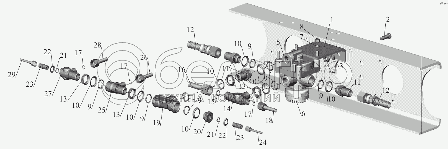 Каталог запасных частей к технике: МАЗ-631236. Установка ускорительного клапана и присоединительной арматуры