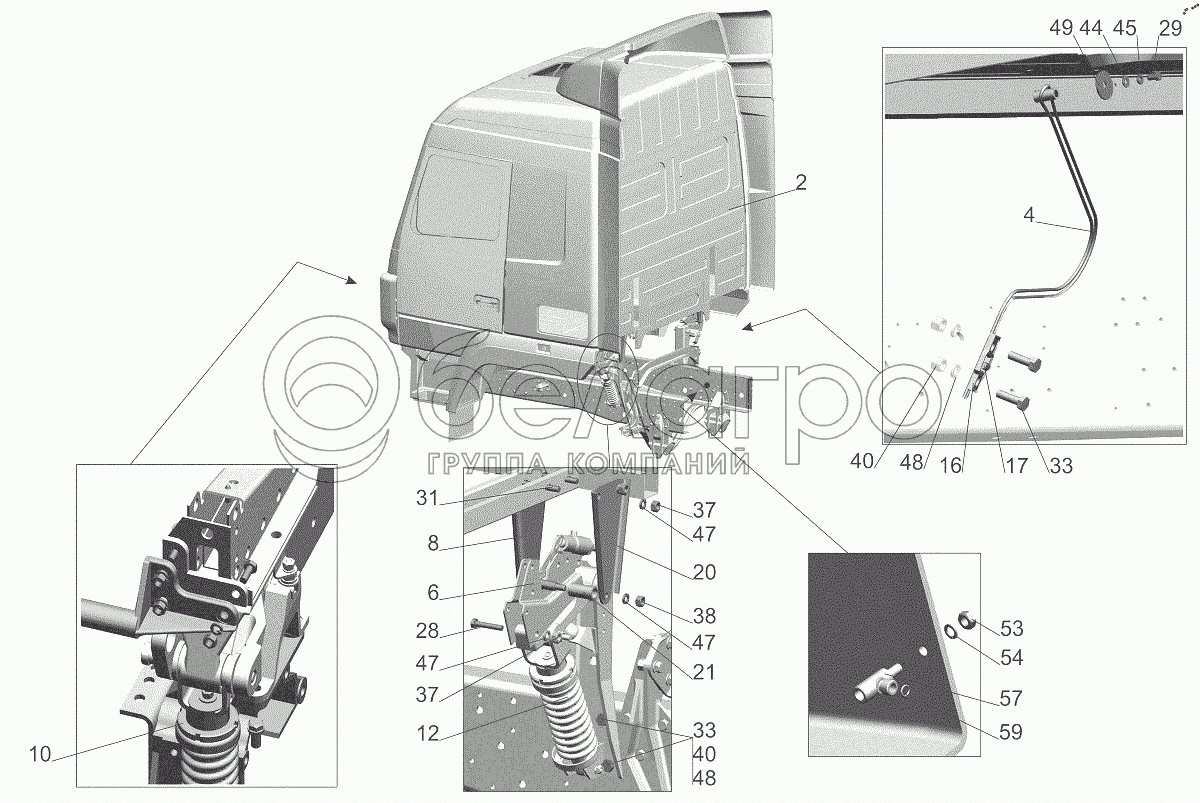 Каталог запасных частей к технике: МАЗ-6312B9-0008425-012. Установка кабины