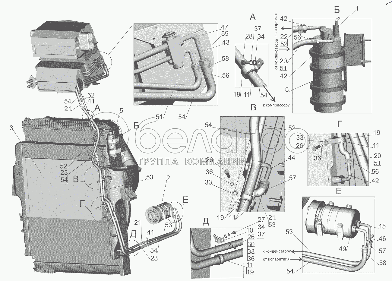 Каталог запасных частей к технике: МАЗ-6312B9-0008425-012. Установка кондиционера 5440B9-8100004