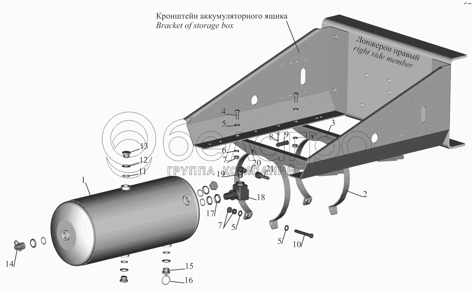 Каталог запасных частей к технике: МАЗ-631705. Установка ресивера 631708-3513005 и присоединительной арматуры
