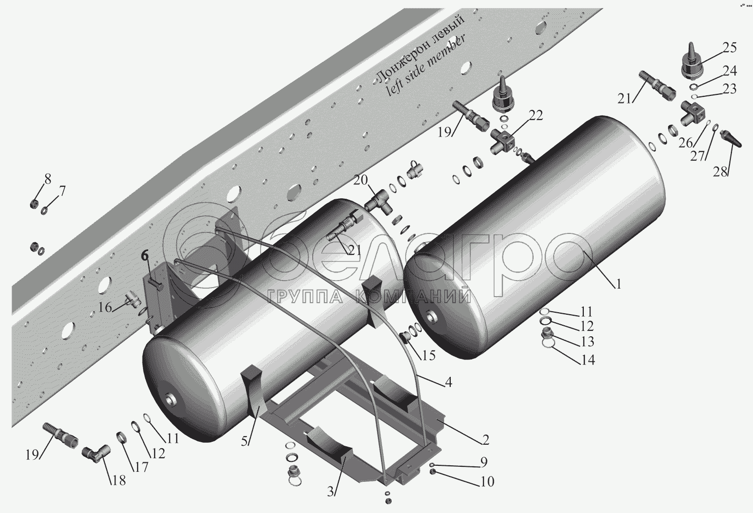Каталог запасных частей к технике: МАЗ-631705. Установка ресиверов 631708-3513004 и присоединительной арматуры