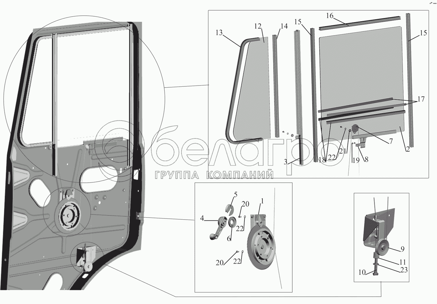 Каталог запасных частей к технике: МАЗ-631705. Установка стеклоподъемника и ручки стеклоподъемника