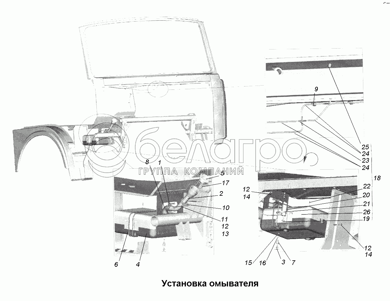 Каталог запасных частей к технике: МАЗ-631705, 631708. Кабина\Установка омывателя