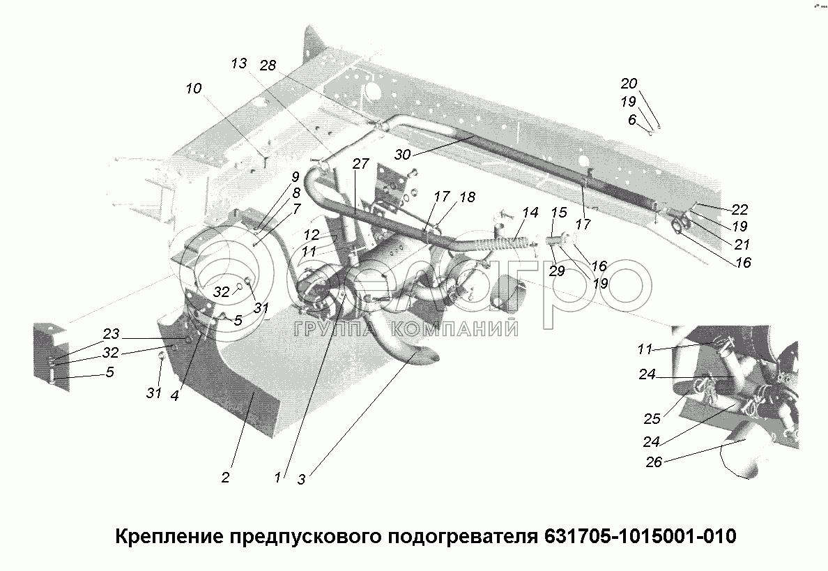 Каталог запасных частей к технике: МАЗ-631705, 631708. Крепление предпускового подогревателя 631705-1015001-010