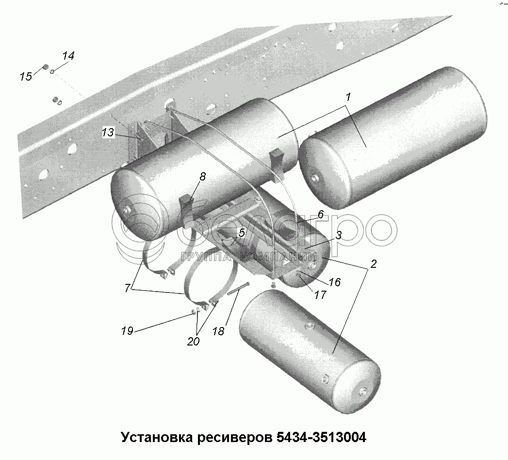 Каталог запасных частей к технике: МАЗ-631705, 631708. Тормоза\Установка ресиверов 5434-3513004
