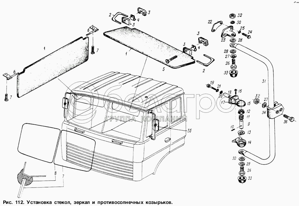 Каталог запасных частей к технике: МАЗ-6317. Установка стекол, зеркал и противосолнечных козырьков