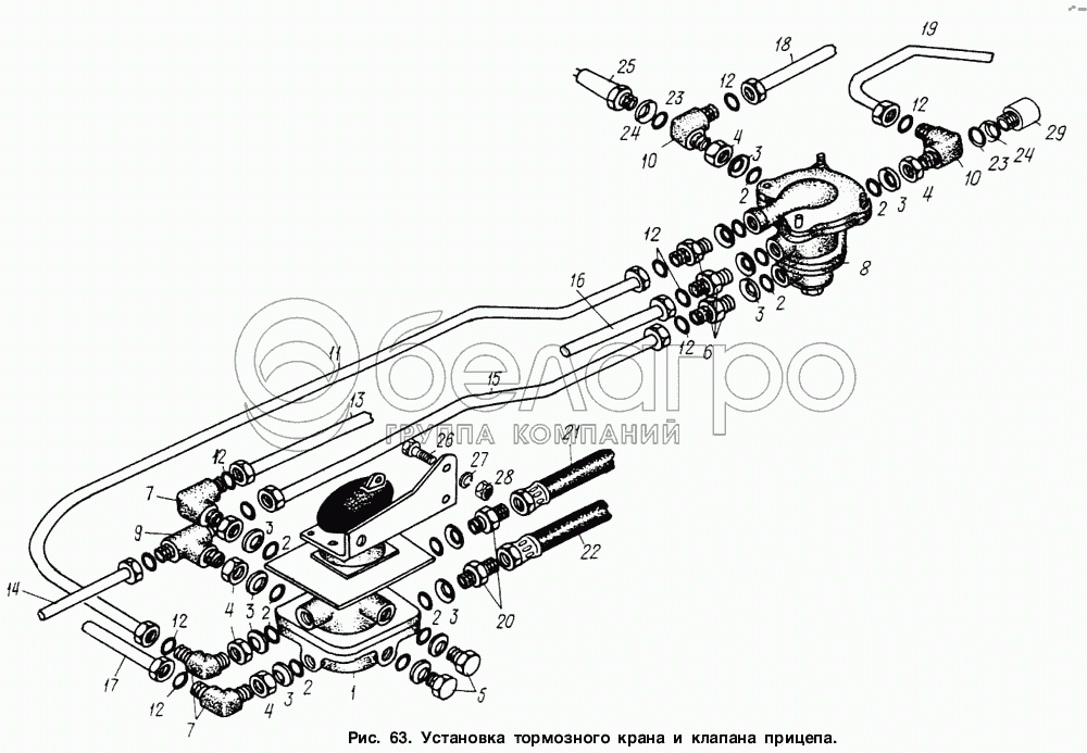 Каталог запасных частей к технике: МАЗ-6317. Установка тормозного крана и клапана прицепа