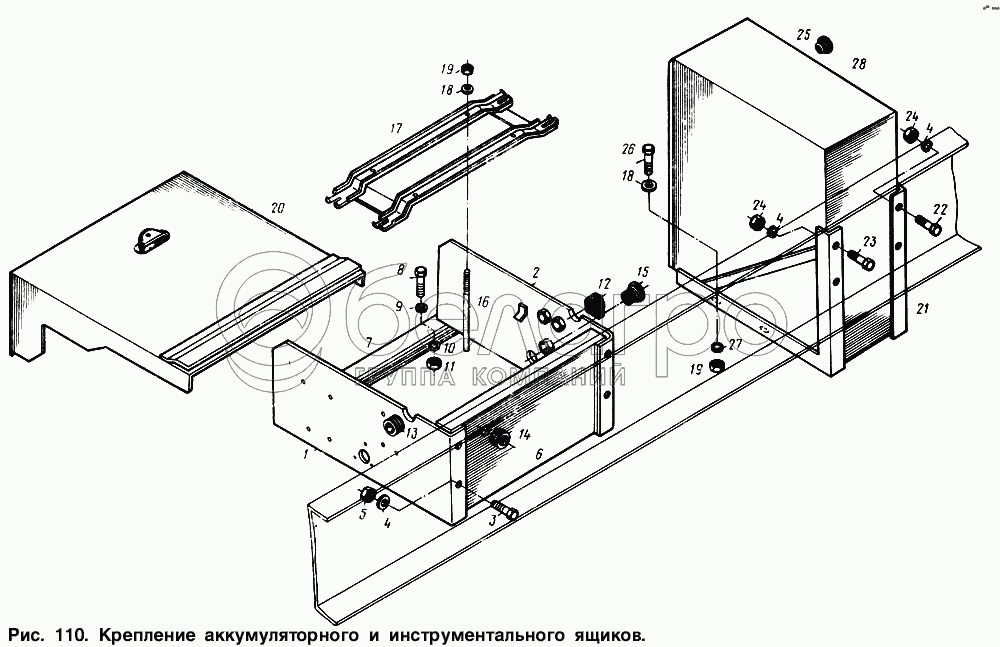 Каталог запасных частей к технике: МАЗ-64221. Крепление аккумуляторного и инструментального ящиков