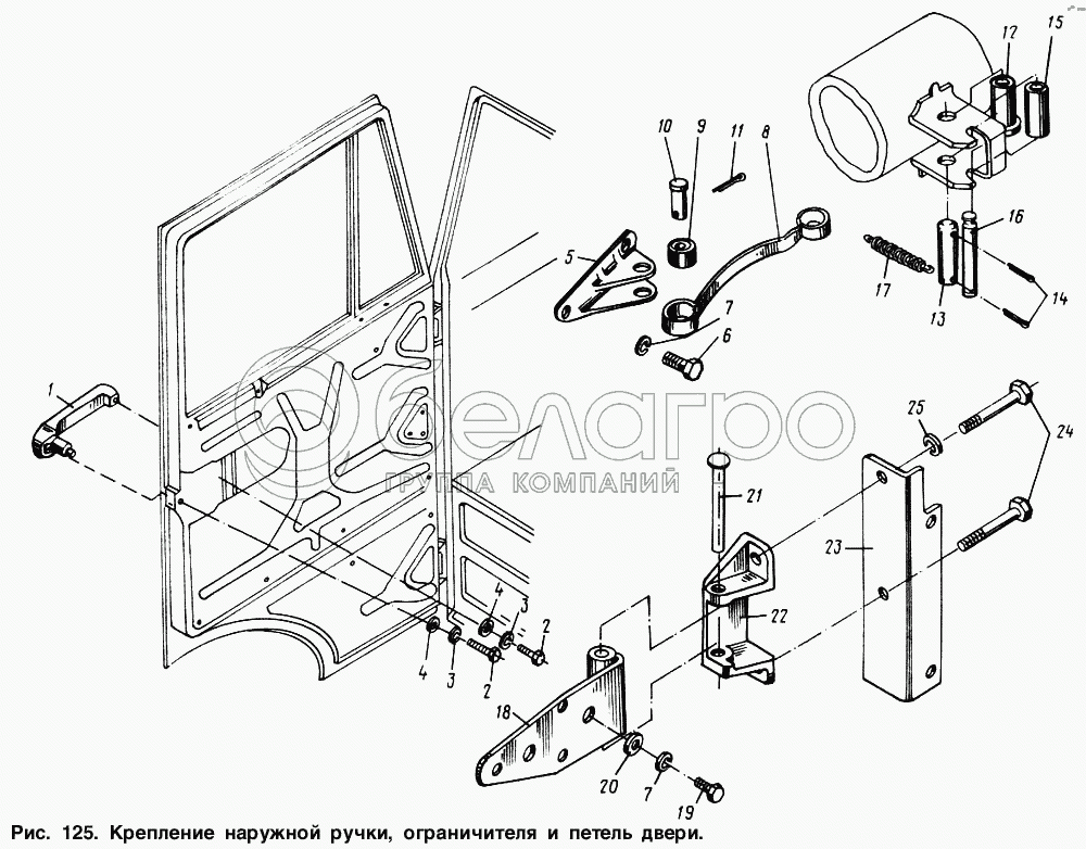 Каталог запасных частей к технике: МАЗ-64221. Крепление наружной ручки, ограничителя и петель двери