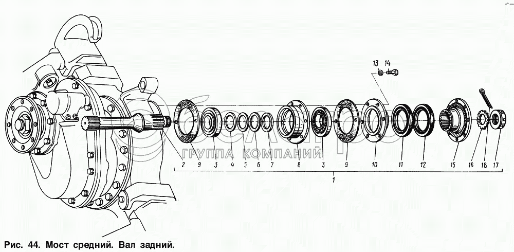 Каталог запасных частей к технике: МАЗ-64221. Мост средний. Вал задний