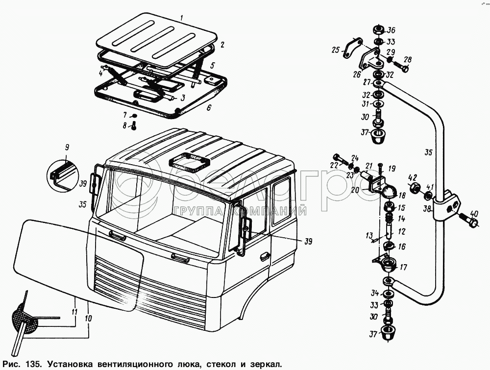 Каталог запасных частей к технике: МАЗ-64221. Установка вентиляционного люка, стекол и зеркал