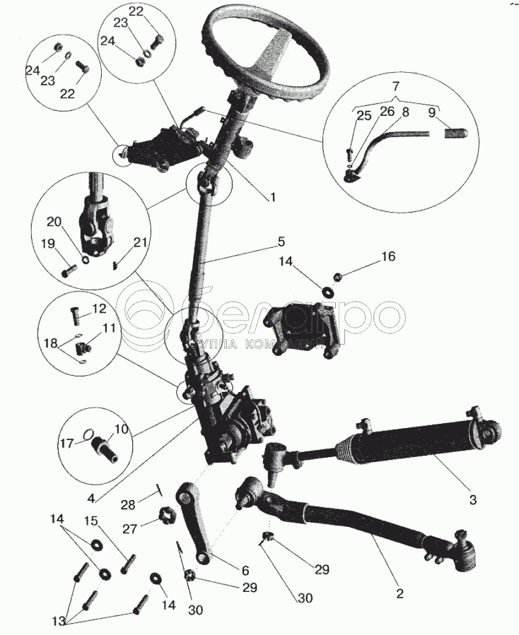 Каталог запасных частей к технике: МАЗ-6422. Установка рулевой колонки и рулевого механизма