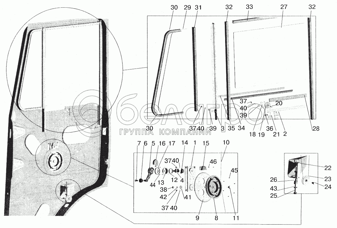 Каталог запасных частей к технике: МАЗ-6422. Установка стеклоподъемника и ручки стеклоподъемника