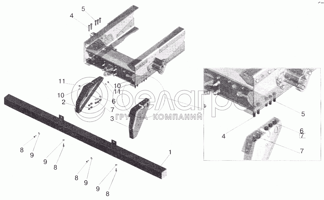 Каталог запасных частей к технике: МАЗ-6422. Установка заднего бампера