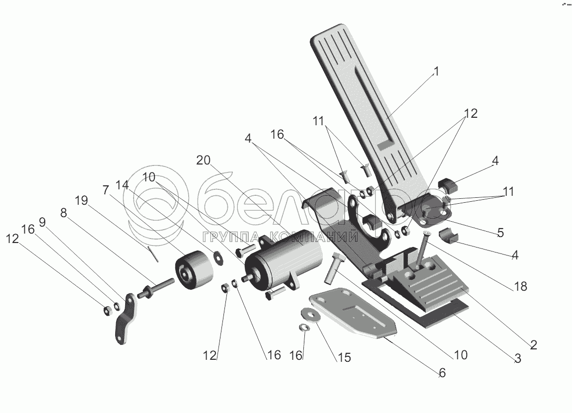 Каталог запасных частей к технике: МАЗ-6422, 5432. Установка педали управления двигателем 642268-1108002