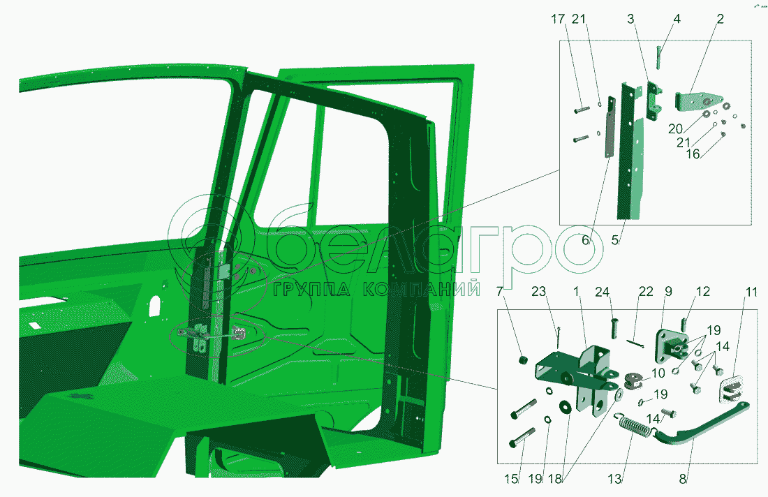 Каталог запасных частей к технике: МАЗ-642505, 642508. Установка ограничителя и петель двери