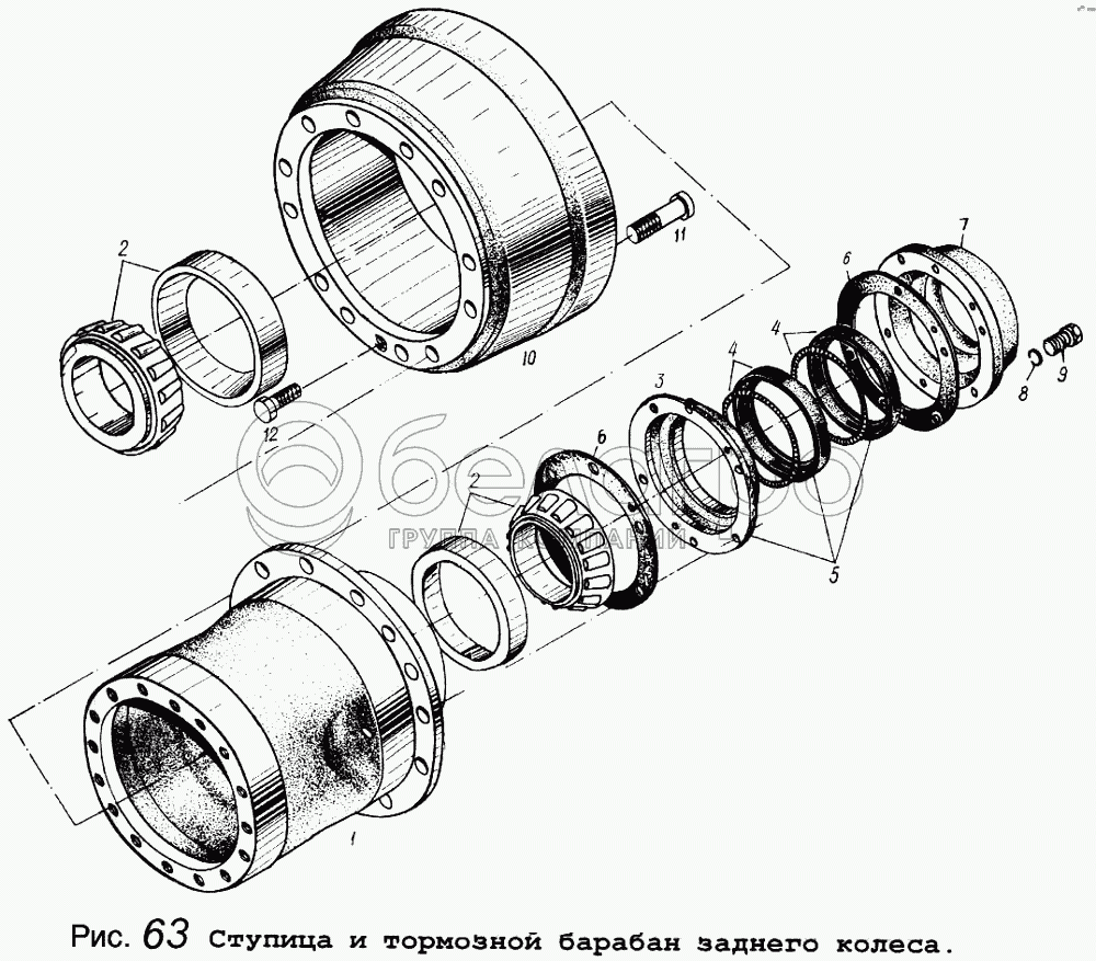 Каталог запасных частей к технике: МАЗ-64255. Ступица и тормозной барабан заднего колеса